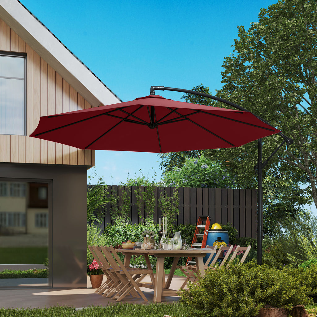This offset cantilever patio umbrella is the perfect choice to add a little shade on those great sunny days. Not just stylish but functional too, this umbrella is made with a high quality weather resistant steel frame and eight umbrella ribs for durability. The cantilever turn crank system makes it easy to open and close and adjust the umbrella as desired. The durable polyester fabric canopy is UV and water-resistant to provide you with the shelter you need to enjoy relaxing on your backyard patio. The umbrella base does not include base weights. We strongly suggest adding weight to the base for the best experience and additional support in high winds.