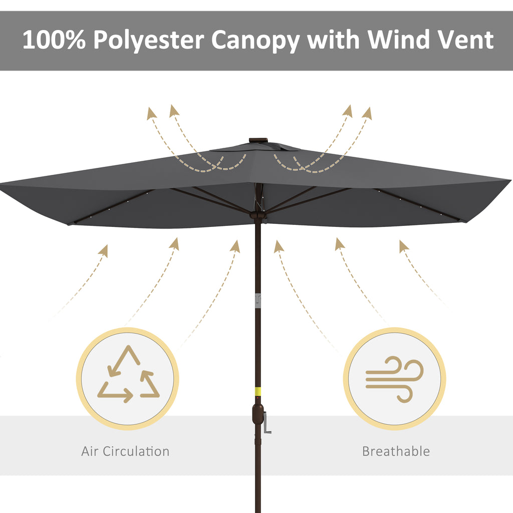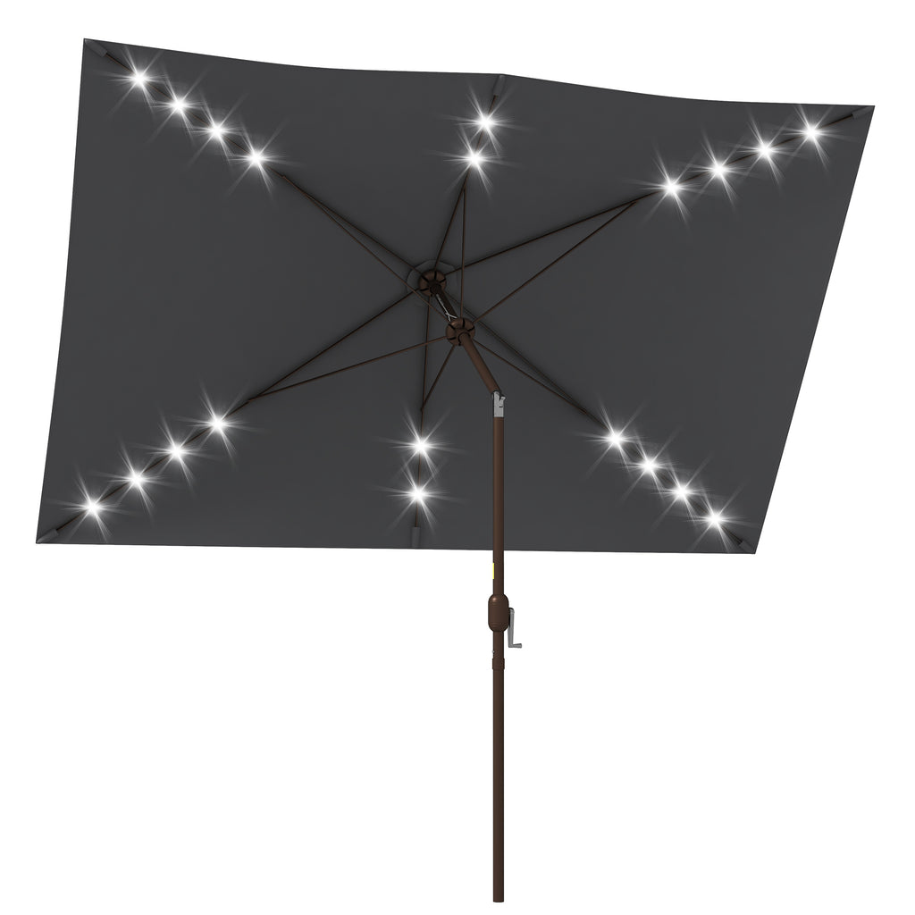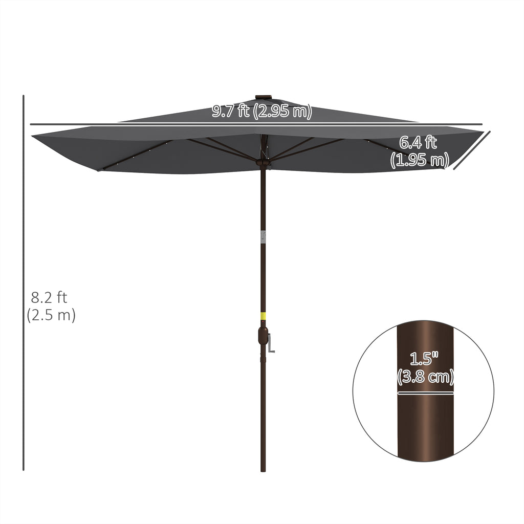 This 6.5' x 10' rectangular patio umbrella features solar-powered LED lights, making it perfect for sunny days and starry nights. Its large canopy shields you from harmful UV rays, while 20 built-in solar LEDs illuminate your outdoor space after dark. Made with durable polyester fabric and a sturdy aluminum pole, this umbrella promises long-lasting performance. Enjoy outdoor comfort and ambiance with this practical and stylish addition to your patio.