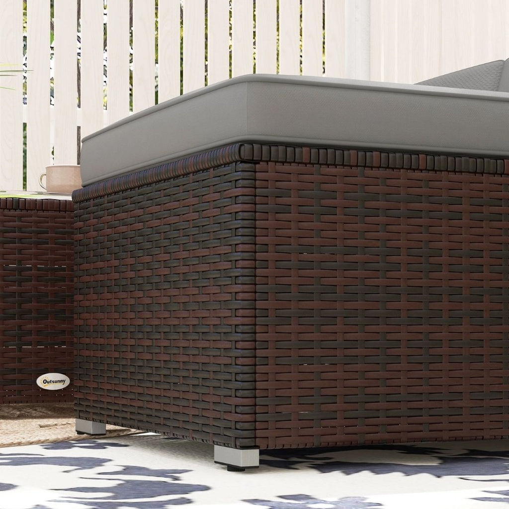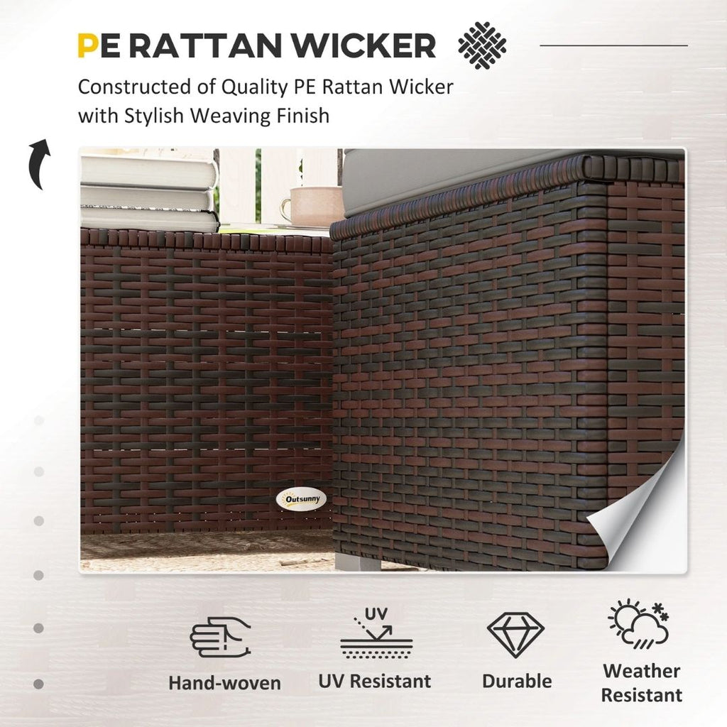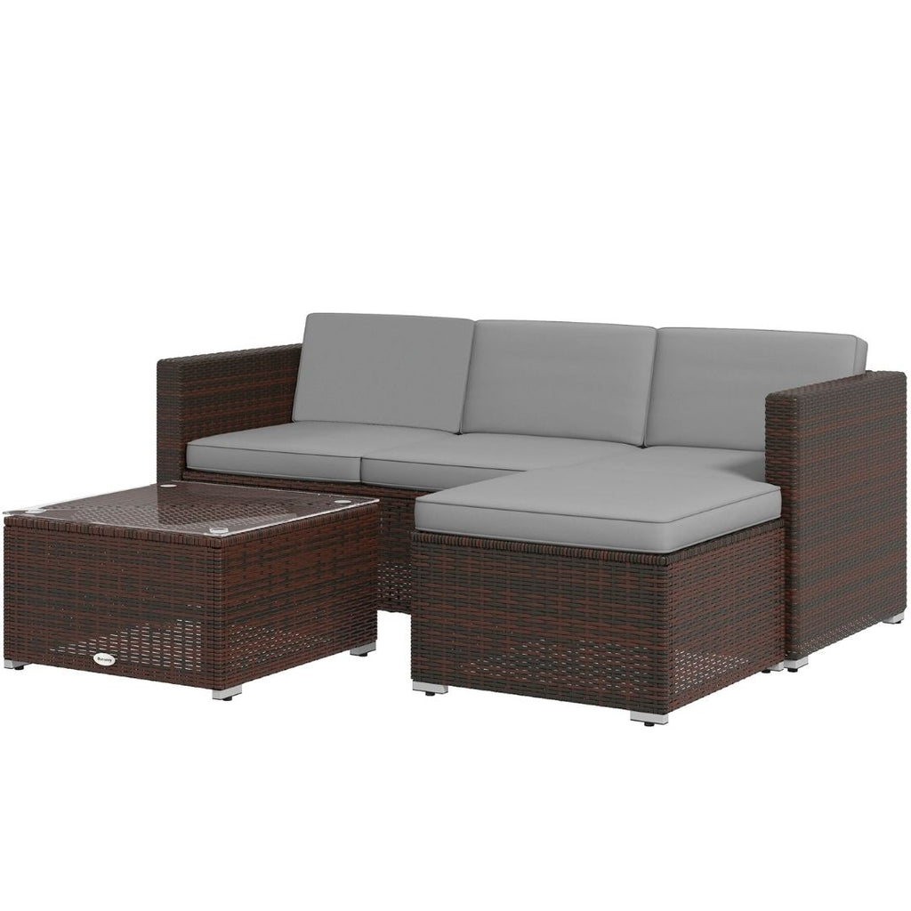• 3pc rattan wicker set features a sofa, an ottoman, and a matching table