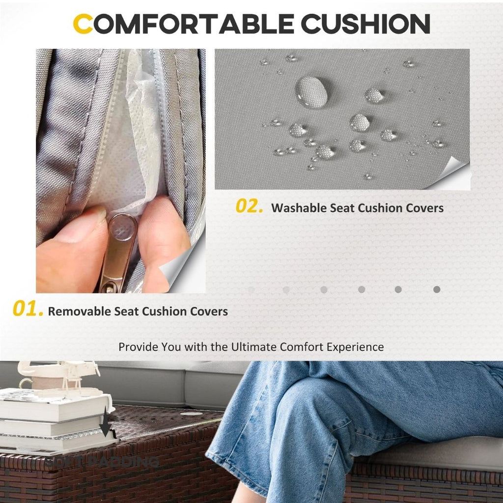 This patio sofa set blends style, comfort, and durability into one attractive package. Crafted with a sturdy steel frame and hand-woven, all-weather PE rattan wicker, it’s built to withstand the elements while adding a touch of style to any setting. Sink into the plush, supportive cushions—made with durable, outdoor-use fabric—for a seating experience that’s pure bliss. The matching table, topped with an easy-to-clean tempered glass surface, is perfect for your snacks, drinks, or decor. Plus, with zippered cushion covers, cleaning them off is a breeze.