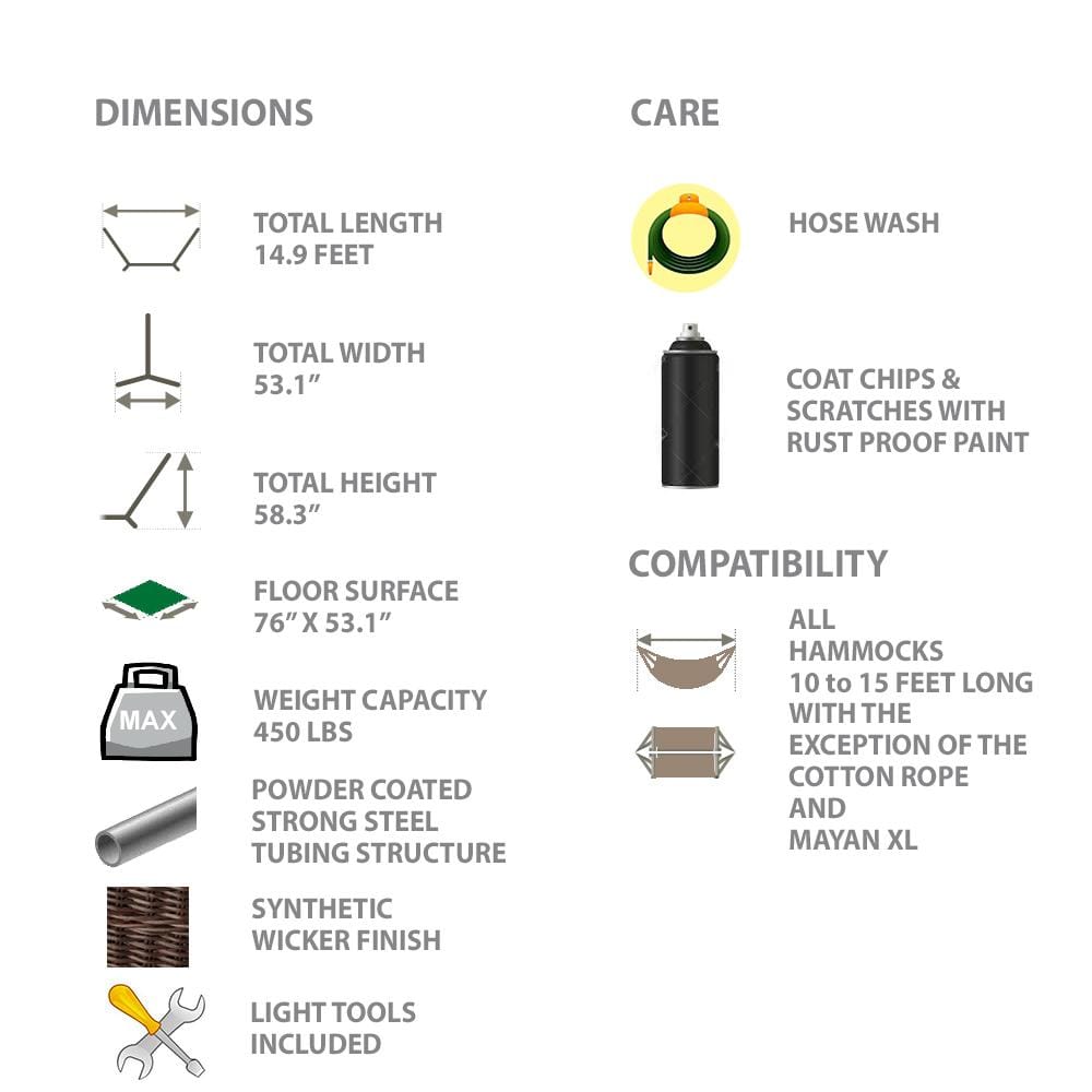 The majestic stand is an arc style and enhances the curb appeal of the hammock. Made of a wicker surface, it's designed to withstand the elements and provide years of support. You can rest at ease knowing this stand will provide the support you need to enjoy an afternoon or evening of enjoyment.