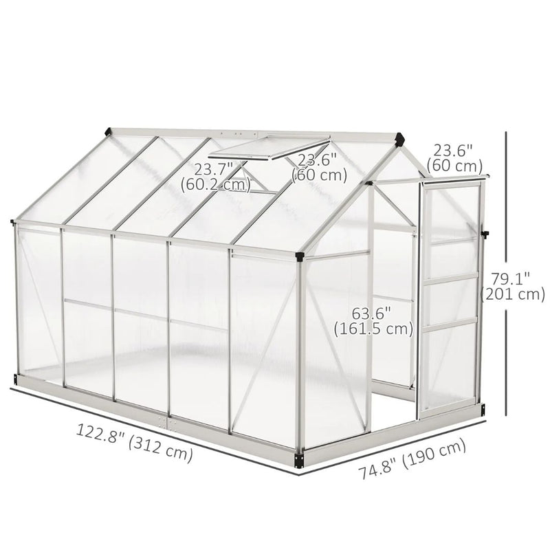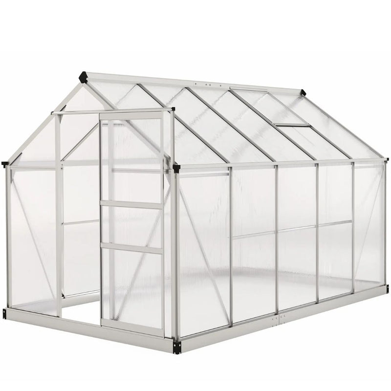 6' x 10' Polycarbonate Walk-in Greenhouse with Aluminum Frame and Sliding Door - Silver