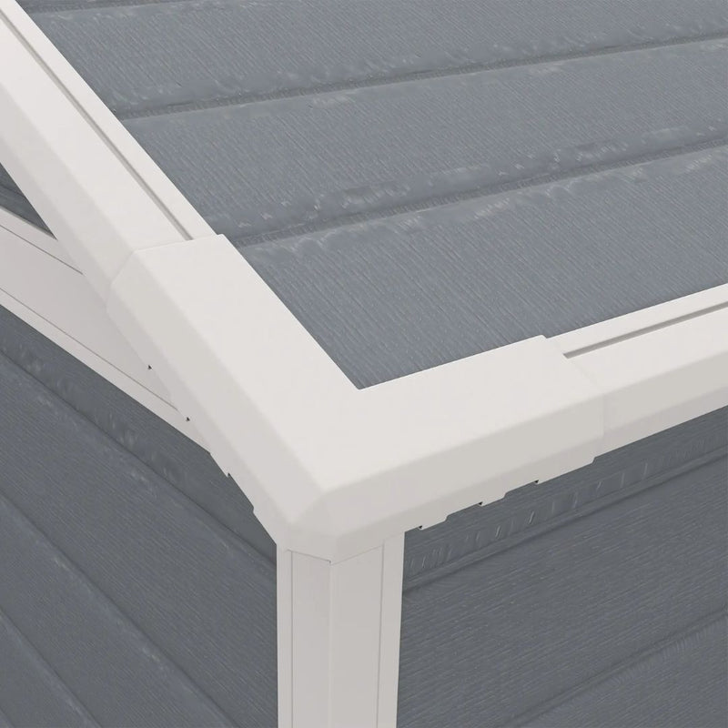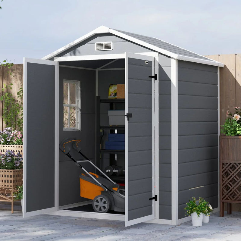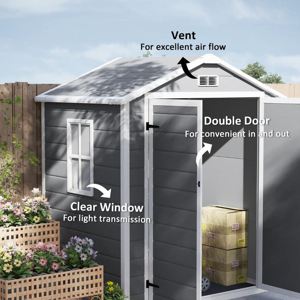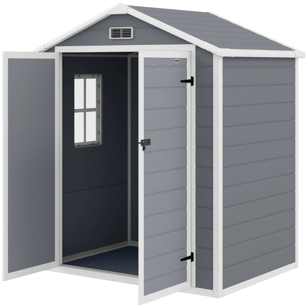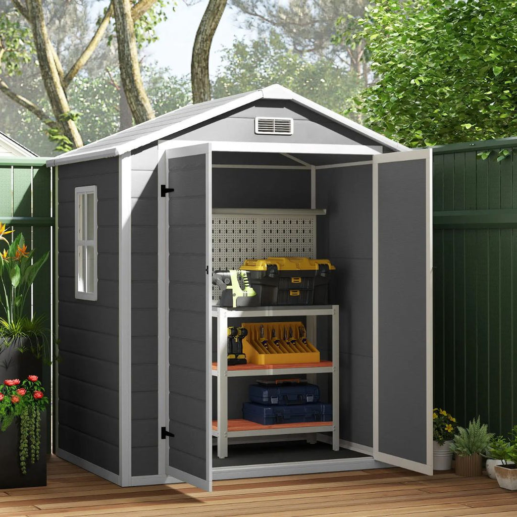 Enjoy spacious and stylish organization with this 6 x 4.5ft outdoor storage shed constructed with robust, UV-resistant polypropylene resin and a built-in floor to keep your tools dry. Constructed with corrosion resistant materials it's sure to last you for may years while maintaining a new appearance. Enjoy natural light from the transparent window and ample airflow from two vents—all in a sleek, faux wood grain design that complements any garden.